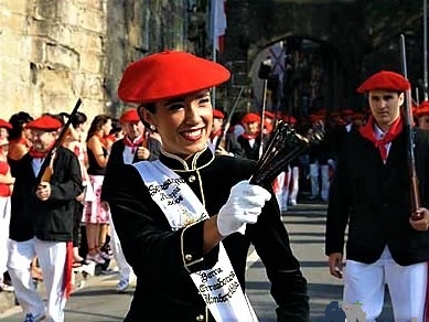 Año 2006. tsaso Berroa Errandonea. Cantinera de la Compañía Semisarga del Alarde de Hondarribia saliendo de la Puerta de Santa María en el año 2006.