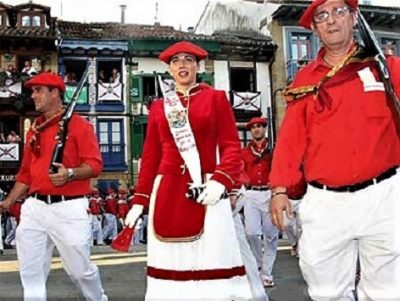 Año 2008. Itxaso Sagarzazu Dolzet. Cantinera de la Compañía Gora Gazteak del Alarde de Hondarribia entrando en la plaza de Armas en 2008.