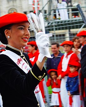Año 2002. Itziar Gómez Salvatierra. Cantinera de la Compañía San Miguel del Alarde de San Marcial de Irún con abanico en el año 2002.