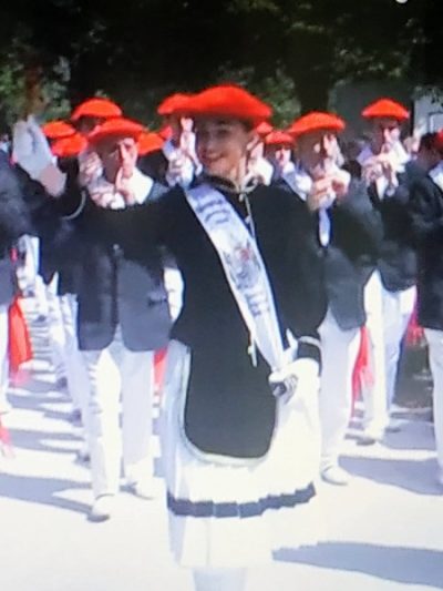 Año 2022. Juncal Zuzaya Gainza. Cantinera de la Tamborrada del Alarde de Hondarribia desfilando en el monte en el año 2022.