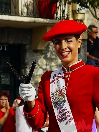 Año 2004. Junkal Amunarriz Tellechea. Cantinera de la Compañía Ama Guadalupekoa del Alarde de Hondarribia sonriendo en el año 2004.