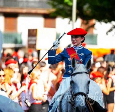 ño 2025. Junkal Thalamas Echeveste. Cantinera de la Escolta de Caballería del General del Alarde de San Marcial saludando 2025A