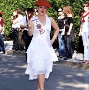 Año 2007. Arte de Cantinera desfilando en la Revista de Armas. Cantinera de la Compañía Olaberría, Beatriz Montero Irazustabarrena. Año 2007 fuente archivo