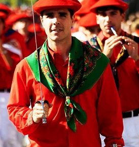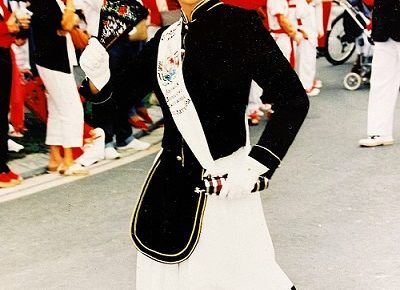 Año 2000. Leire Amunarriz Eceiza. Cantinera de la Compañía Ama Guadalupekoa del Alarde de Hondarribia sonriendo en el 2000