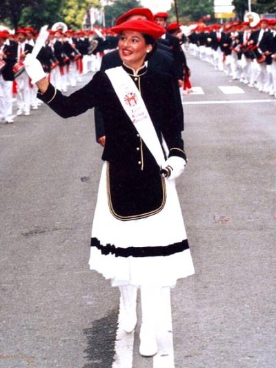 Año 1998. Leire Hidalgo Mardones. Cantinera de la Tamborrada del Alarde de San Marcial de Irún saludando en el año 1998