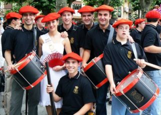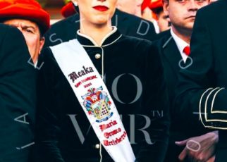 Año 2012. Leire Sunsundegui Yarzabal. Cantinera de la Compañía Arkoll del Alarde de Hondarribia sonriendo en el año 2012.