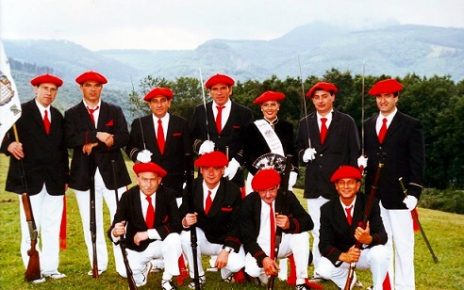 Año 1997. Mª Juncal Ceberio Unsain. Cantinera de la Compañía Montaña del Alarde de Hondarribia conversando en 1997