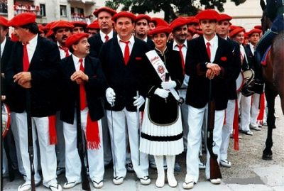 Año 1994. Mª Rosa Zabalo Urtxegi. Cantinera de la Compañía Meaka del Alarde de San Marcial de Irún en la plaza San Juan 1994