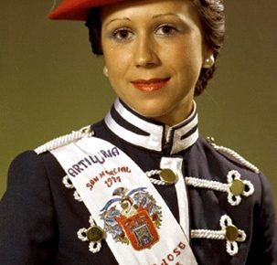 Año 1991. Mª Semper Rodriguez. Cantinera de la Compañía San Miguel del Alarde de San Marcial de Irún sonriendo 1991