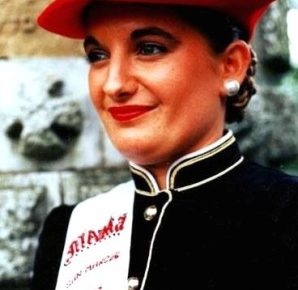 Año 2014. Maialen Ugarte Cortés. Cantinera de la Compañía Azken Portu del Alarde de San Marcial de Irún sonriendo en el año 2014.