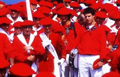 Año 2002. Maider Arina Zumeta. Cantinera de la Compañía Gora Ama Guadalupekoa del Alarde de Hondarribia rodeada en el 2002