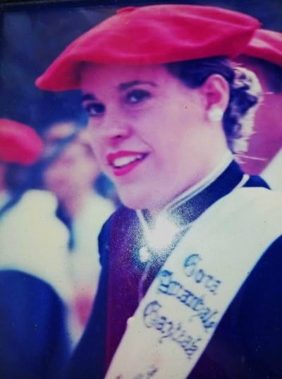 Año 1996. Marga Emazabel Emparan. Cantinera de la Compañía Gora Arrantzale Gazteak del Alarde de Hondarribia sonriendo en 1996
