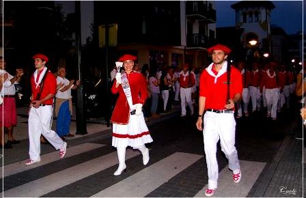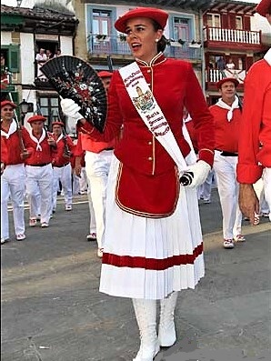 Año 2008. María Serrano Olaskoaga. Cantinera de la Compañía Gora Ama Guadalupekoa del Alarde de Hondarribia entrando en la Plaza de Armas en 2008.