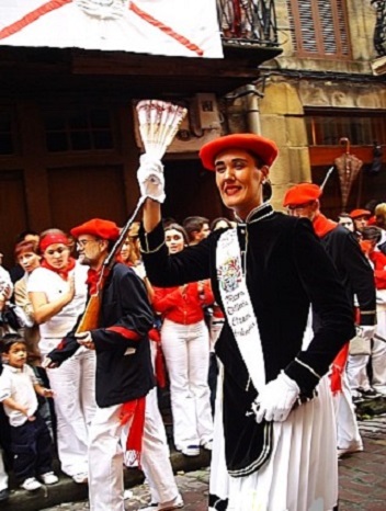 Año 2002. Miren Tellería Etxarri. Cantinera de la Compañía Olearso del Alarde de Hondarribia en la calle Mayor 2002