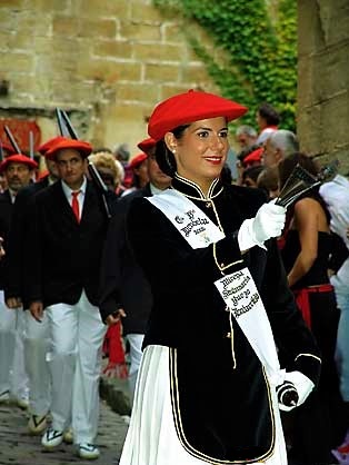 Año 2005. Mireya Santamaria Buezo. Cantinera de la Compañía Mendelu del Alarde de Hondarribia en la puerta de Santa María 2005.