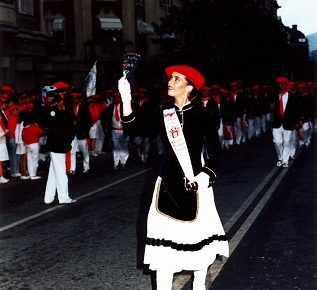 Año 1998. Monica Oyarzabal Portugal. Cantinera de la Compañía Azken Portu del Alarde de San Marcial de Irún sonriendo en 1998