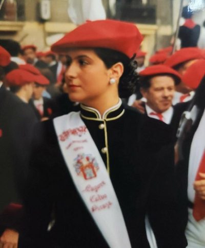 Año 1994. Nagore Calvo Picaza. Cantinera de la Compañía Uranzu del Alarde de San Marcial de Irún esperando en 1994