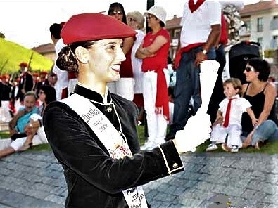 Año 2008. Nahia Osinaga Maza. Cantinera de la Compañía Kosta del Alarde de Hondarribia saludando en el desfile del año 2008.