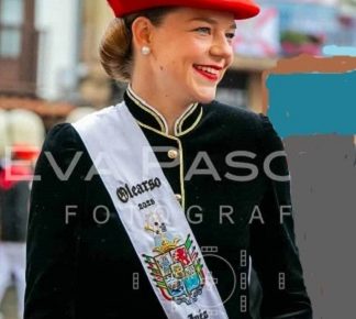 Año 2009. Naiara Zubillaga Corredera. Cantinera de la Compañía Gora Gazteak del Alarde de Hondarribia saludando en el año 2009.