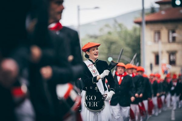 Año 2022. Nerea Paternain Navarro. Cantinera de la Compañía Santiago del Alarde de San Marcial de Irún en el paseo Colón en 2022.