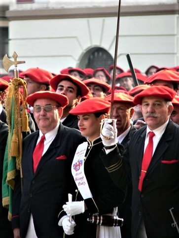 Año 2006. Olaia Bedoya Ruiz. Cantinera de la Compañía Belaskoenea del Alarde de San Marcial de Irún junto al Capitán en el año 2006