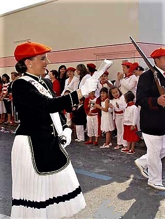 Año 2006. Saioa Mujika Errazkin. Cantinera de la Compañía Meaka del Alarde de San Marcial de Irún saludando en el año 2006.