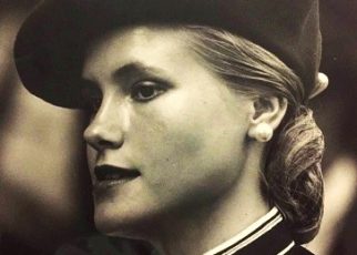 La Cantinera de la Batería de Artillería de Irún, Naikari Soler. Bajando camino de la Iglesia y de las txupinas en el Alarde de la mañana. fuente archivo