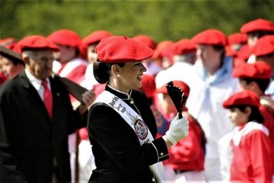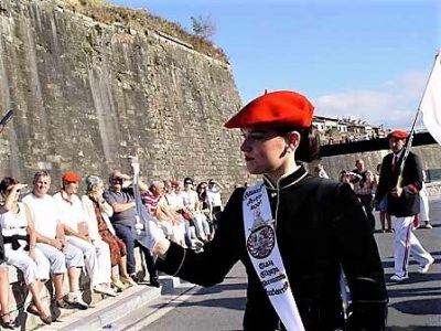Año 2008. Miren Arocena Jiménez. Cantinera de la Compañía Akartegi del Alarde de Hondarribia saludando en el año 2008. fuente archivo