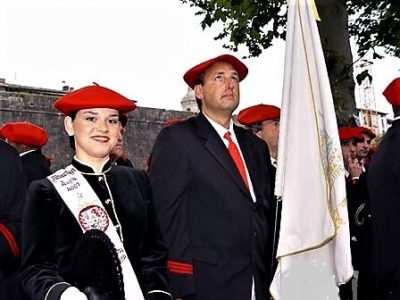 Año 2007. Olatz Elizazu Garmendia Cantinera Akartegi del Alarde de Hondarribia en la presentación de Cantineras junto a Lierni Arambarri (Montaña). fuente archivo