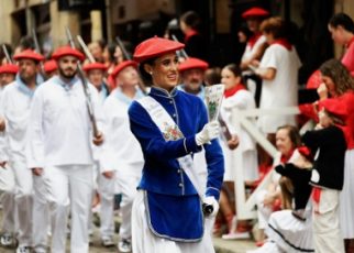 Año 2007. Amaia Lera Manterola. Cantinera de la Compañía Anaka del Alarde de san Marcial de Irún bajando cuesta San Marcial en el año 2007. fuente A. Calvo