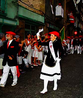 Año 2004. Alaitz Susperregi Aseguinolaza. Cantinera de la Compañía Belaskoenea del Alarde de San Marcial de Irún descendiendo por la calle Mayor en 2004. fuente archivo