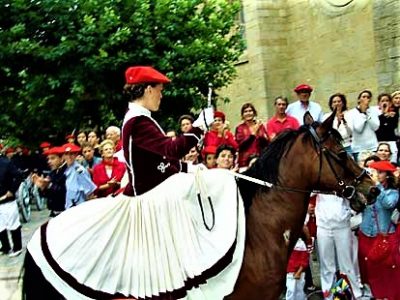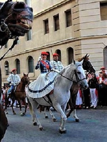 Año 2005. Carla Iridoy Duerto. Cantinera de la Escolta de Caballería del Alarde de Hondarribia saludando con la fusta en el año 2005. fuente archivo