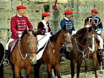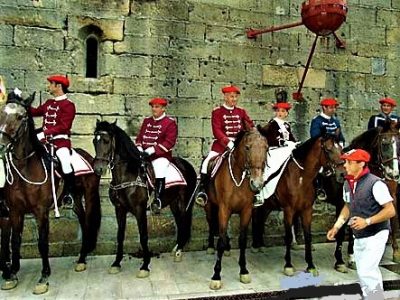 Año 2005. Carla Iridoy Duerto. Cantinera de la Escolta de Caballería del Alarde de Hondarribia estabulación delante del Parador Carlos V en el año 2005. fuente archivo