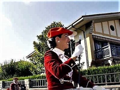 Año 2006. Arantza Martínez Etxebeste. Cantinera Escolta de Caballería del Alarde de Hondarribia bajando la Calle Mayor en 2006. fuente archivo