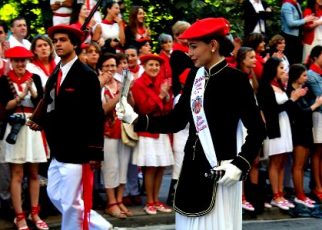Año 2016. Laura Guillén García. Cantinera de la Compañía Azken Portu del Alarde de San Marcial de Irún, entrando en la Plaza San Juan en el añ 2016. foto Maialen Cueto
