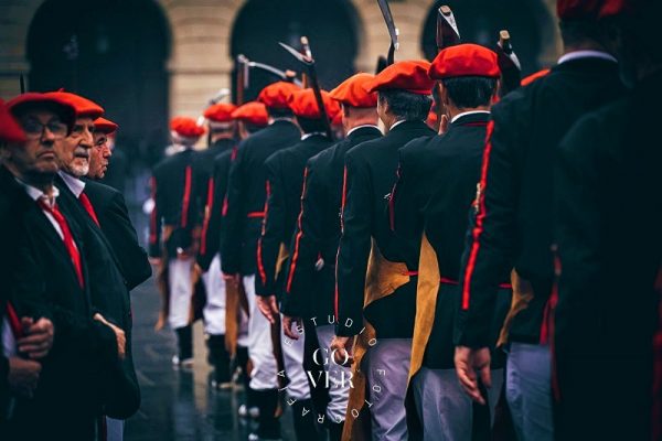 Año 2022. La Escuadra de Hacheros del Alarde de San Marcial de Irún saliendo en de la plaza de San Juan en el año 2022. foto Gover