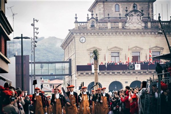 Año 2022. La Escuadra de Hacheros del Alarde de San Marcial de Irún entrando en la calle Mayor en el año 2022. foto Gover
