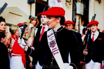 Año 2018. Itsaso Aranburu Bernal. Cantinera de la Compañía Uranzu, del Alarde de San Marcial de Irún, en la bajada de la Iglesia, en el año 2018. foto Nuria Cordoba