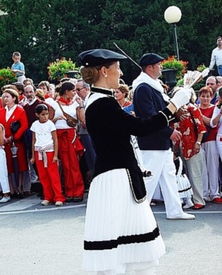 Año 2002. Elena Arbelaiz Goyogana. Cantinera de Done Pedro Itsas Gizonen Kofradia del Alarde de Hondarribia saludando en 2002 fuente festak