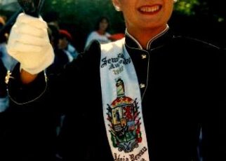 Año 2011. Maialen García Arruabarrena. Cantinera de la Compañía Azken Portu del Alarde de San Marcial de Irún saludando en 2011. fuente Maialen García