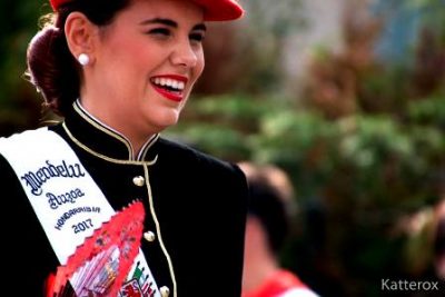Año 2017. Laura Gorrotxategi Nanclares. Cantinera de la Compañía Mendelu del Alarde de Hondarribia, en esta imagen de alegría, en el año 2017. foto Katterox