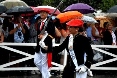 Año 2016. Sara Escalante Vázquez. Cantinera de la Compañía Mendelu del Alarde de Hondarribia, desfilando bajo la lluvia en el año 2016. foto Saray López