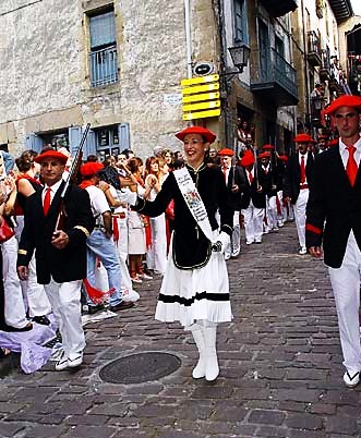 Año 2004. Nagore Arbelaitz Irazusta. Cantinera Compañía Mendelu del Alarde de Hondarribia en la calle Mayor en 2004. fuente archivo