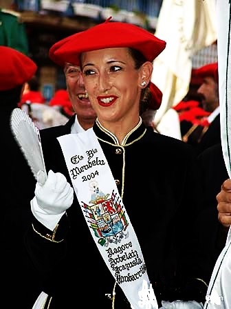 Año 2004. Nagore Arbelaitz Irazusta. Cantinera de la Compañía Mendelu del Alarde de Hondarribia en la Plaza de Armas en el año 2004. fuente archivo