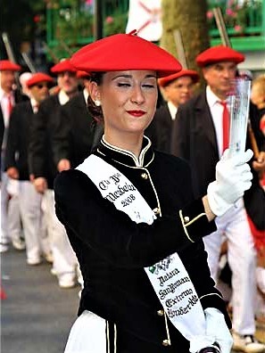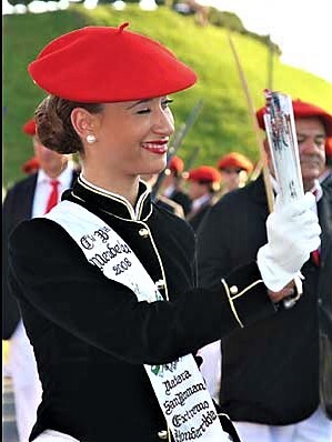 Año 2008. Naiara San Roman Extremo. Cantinera de la Compañía Mendelu del Alarde de Hondarribia saludando en el año 2008. fuente archivo