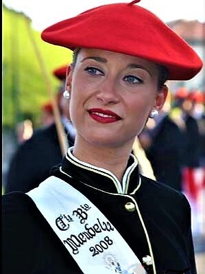 Año 2008. Naiara San Roman Extremo. Cantinera de la Compañía Mendelu del Alarde de Hondarribia sonriendo en el año 2008. fuente archivo
