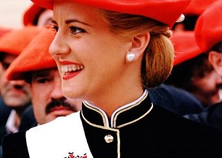 Año 2003. Mertxe Elizalde Carmona. Cantinera de la Compañía Olaberria del Alarde de San Marcial de Irún saliendo de San Juan en el año 2003. fuente festak