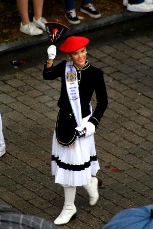 Año 2015. Mª Aranzazu García Alegre de la Torre. Cantinera de la Compañía Mixta del Alarde de Hondarribia saludando en el año 2015. fuente archivo