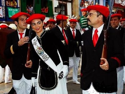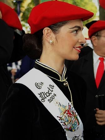 Año 2004. Marta Urbiola Ochoa. Cantinera de la Compañía Mixta del Alarde de Hondarribia en la calle Mayor en el año 2004. fuente archivo