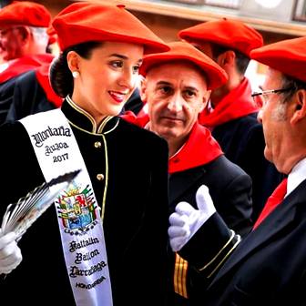 Año 2018. Irene Duinat Berrotaran. Cantinera de la Compañía Montaña, del Alarde de Hondarribia,en las descargas del año 2018. fuente Irene Duinat